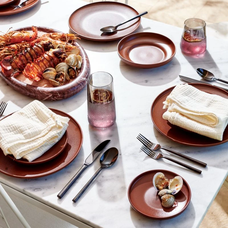 Sleek and balanced, flatware is forged with substantial heft in 18/0 stainless steel (13/0 for the knife). Brushed black finish. Five-piece setting serves a party of four. CB2 exclusive.