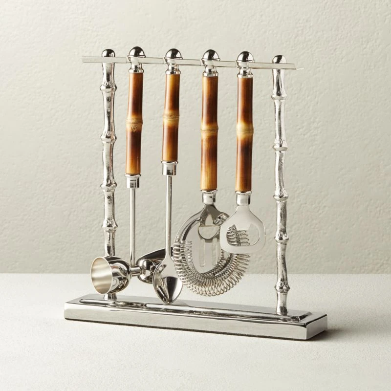 Vintage-inspired bar tool set is made for display. Tools hang upside down from a shiny nickel-finished stand with bamboo detailing. Stainless steel strainer, bottle opener, stirring spoon and jigger are handled with natural bamboo, burnt for a unique finish that varies from piece to piece. CB2 exclusive.
