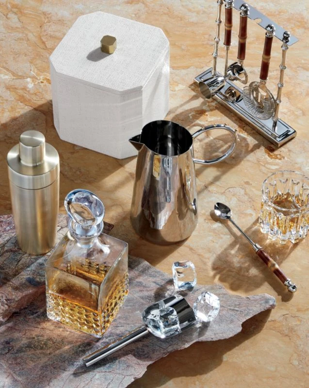- Steel strainer, bottle opener, stirring spoon and jigger with natural bamboo handles and burnt finish