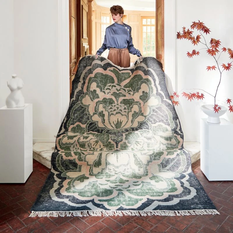 Designed by House of Heras, a boutique wallpaper and fabric studio, wool rug lays down a fresh, graphic floral print with vintage texture. Hand-knotted by master craftsmen in Bhadohi, India with 15–16 knots per square inch. Rug is finished with handbound edges and fringe on two sides. CB2 exclusive.