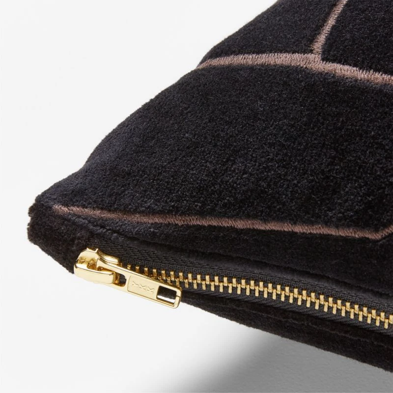 Black velvet throw pillow by Studio Anansi sports light brown embroidery in a meandering, abstract pattern on the front. On the reverse, solid black velvet adds even more softness. CB2 pillows include a pillow insert in your choice of feather down or down alternative. CB2 exclusive.