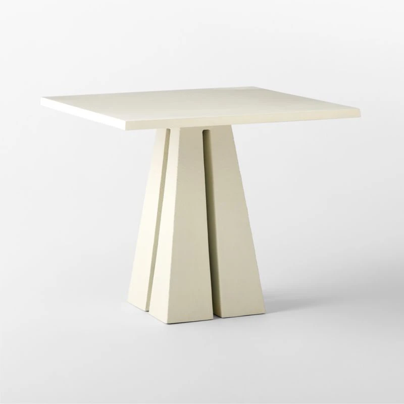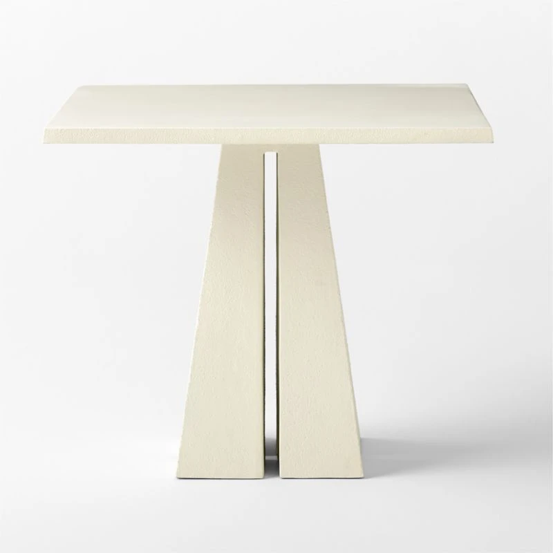 Square bistro table by Mermelada Estudio wears its Brutalist inspiration well in white. Monolithic silhouette features four tapered cast aluminum legs with a rough, sandcast texture that contrasts with the glossy powdercoated white top. Compact footprint easily fits on patios and balconies, yet offers seating for four. CB2 exclusive.