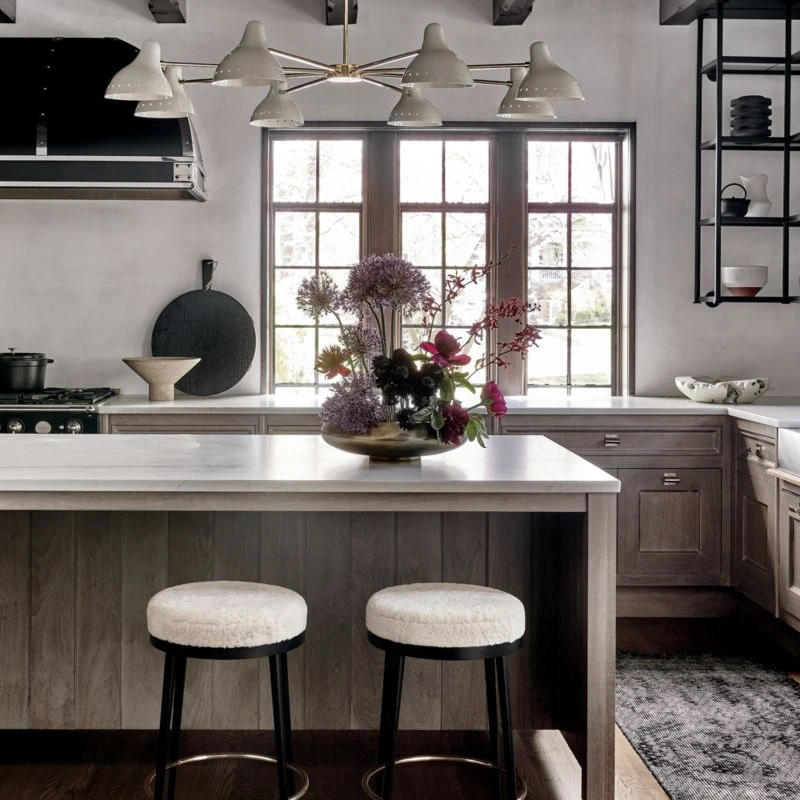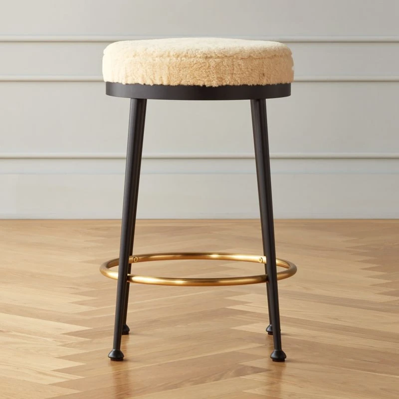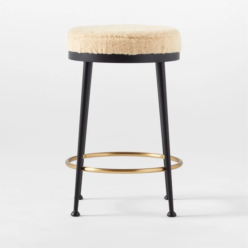 Caleb Zipper elevates the classic bar stool silhouette with high-end finishes. Iron tube frame features a rich, matte black, textured finish and round brass-plated foot rest. Seat is topped in 100% natural shearling for a luxe place to relax. Learn more about Caleb Zipperer on our blog. CB2 exclusive.