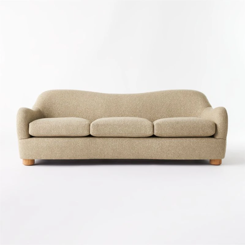 Boucle takes on camel-colored hues in loungeable sofa designed by Ross Cassidy. Bubbly in shape with rounded legs of solid bleached oak and an oversized silhouette made for spreading out. CB2 exclusive.
