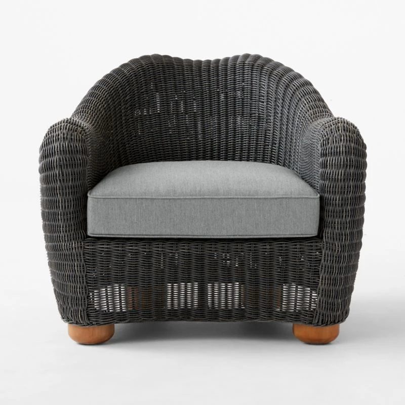 The bestselling Bacio upholstery collection goes outside in one of designer Ross Cassidy’s favorite materials: faux rattan that has all the natural appeal of the real thing, but will stand the test of time. Charcoal grey all-weather lounge chair rests atop rounded feet crafted from eucalyptus and is exceptionally easy to live with, thanks to a pewter grey cushion wrapped in Sunbrella performance fabric. CB2 exclusive.