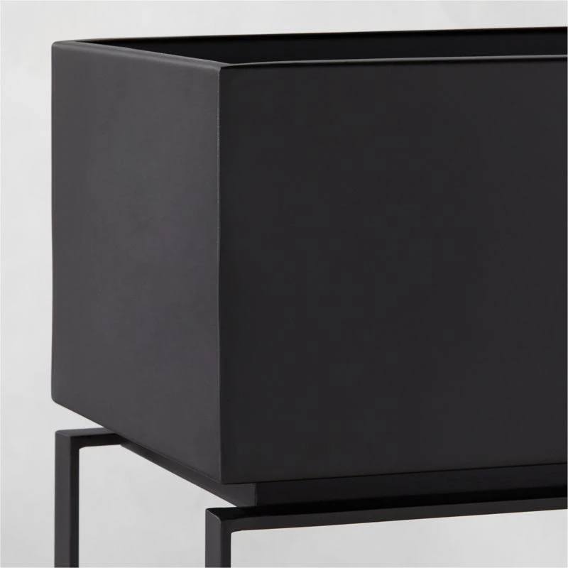 Low planter brings sleek geometric design to outdoor settings. Elevated on a rectangular base, steel is powdercoated in matte black, serving as a bold contrast to lush greenery. Great for planting herbs. CB2 exclusive.
