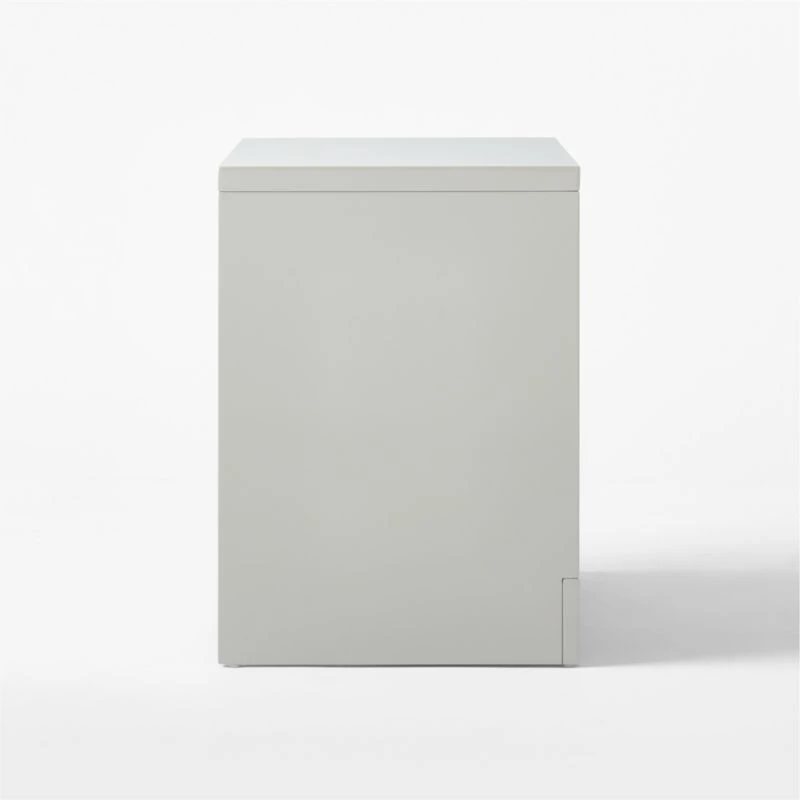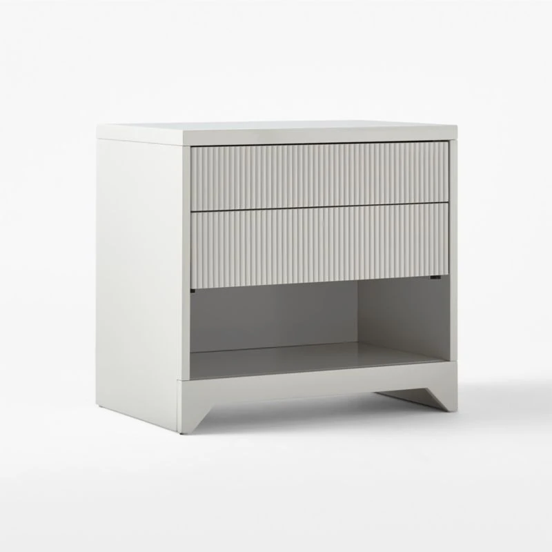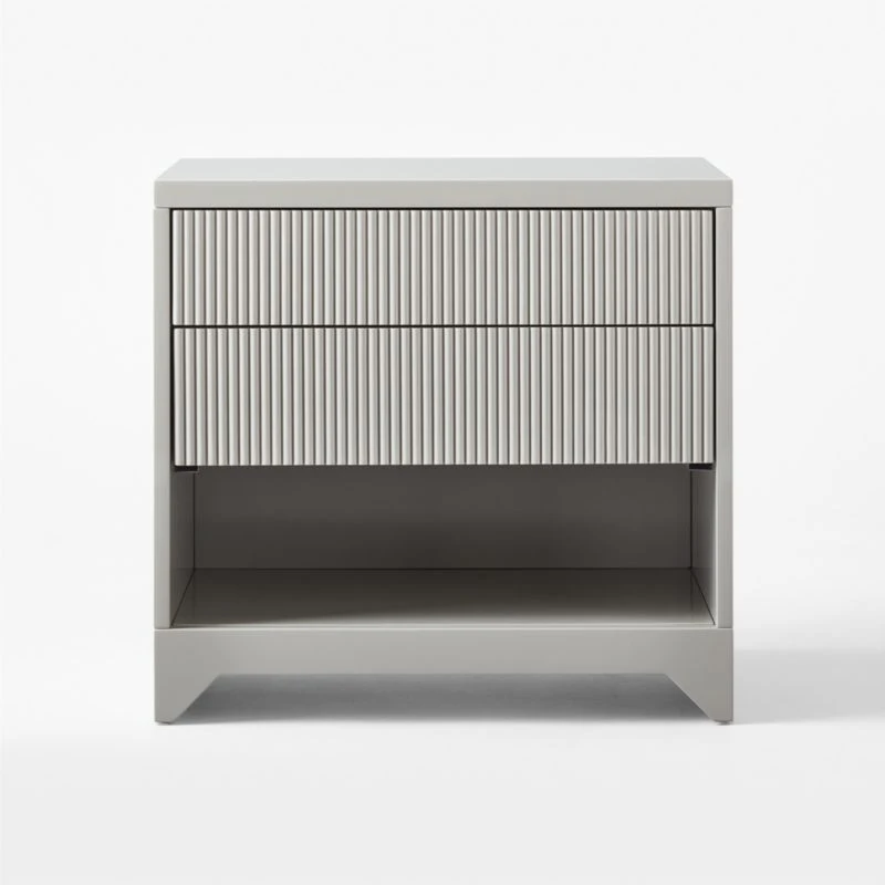 Designed by Brett Beldock, warm grey nightstand creates clean, sophisticated lines with a high-gloss lacquered finish. Channels of poplar wood certified sustainable by the Forest Stewardship Council ® front the single push-to-open drawer, adding a sculptural detail to complete the look. CB2 exclusive.