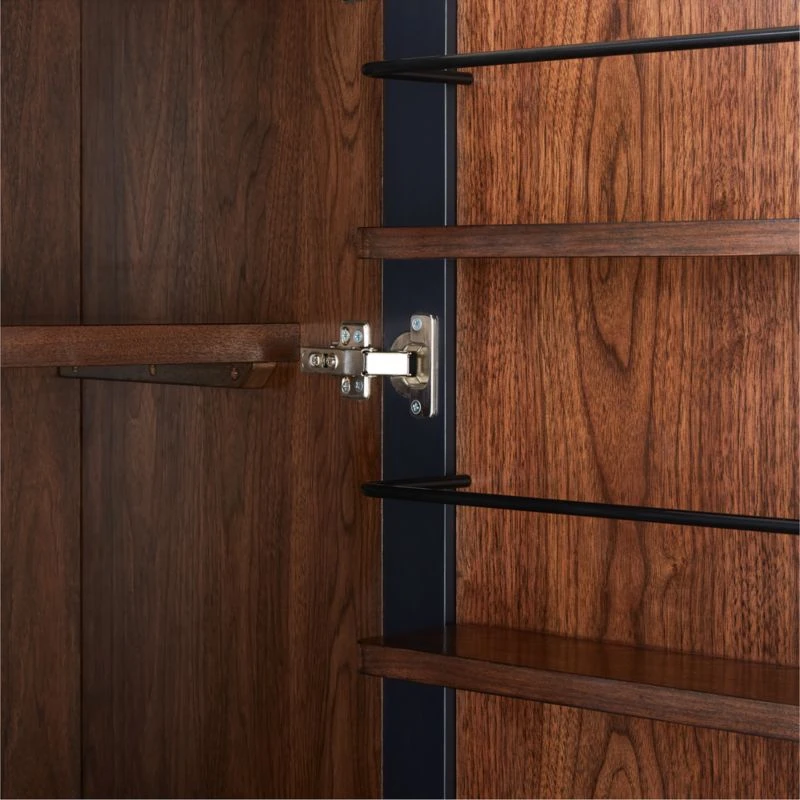 Robust with a subtle graphic element, stately bar cabinet by Caleb Zipperer is resplendent from all angles. Its molded resin doors and drawer are crimped for a scalloped effect, then adorned with a beautiful midnight blue lacquer. The generously sized case, clad in black walnut veneer certified sustainable by the Forest Stewardship Council ® (FSC), opens to reveal room for glassware, spirits and bartending tools. A lower drawer offers linen storage, while thoughtful details like soft-close hinges and glossy feet negotiate a balance between form and function. CB2 exclusive.