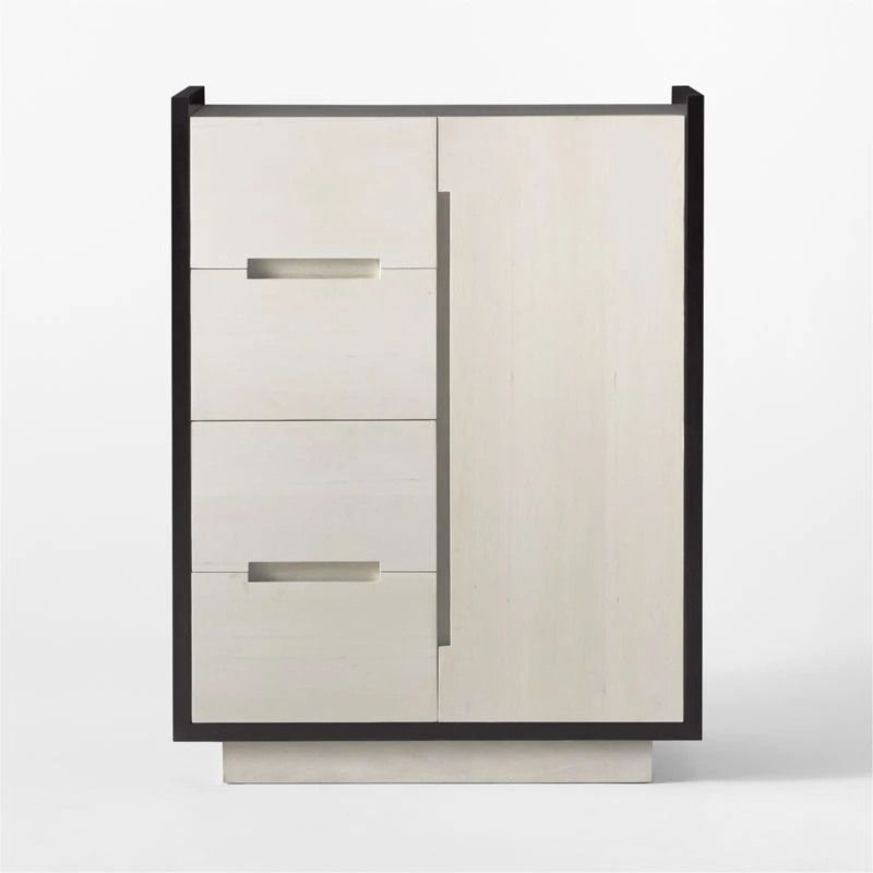 Designer Nicholas Obeid brings a graphic pop to the bedroom with this striking chifferobe. White washed solid acacia wood door and drawers are framed in contrasting blackened mango wood. Four drawers and a removable hanging bar inside the door provide ample storage. CB2 exclusive.