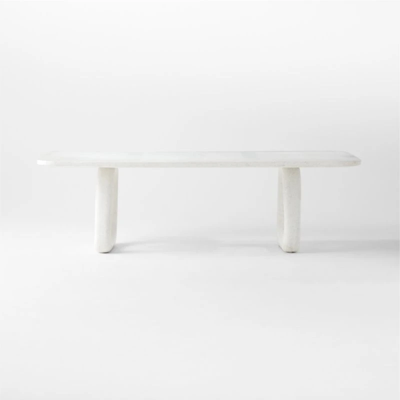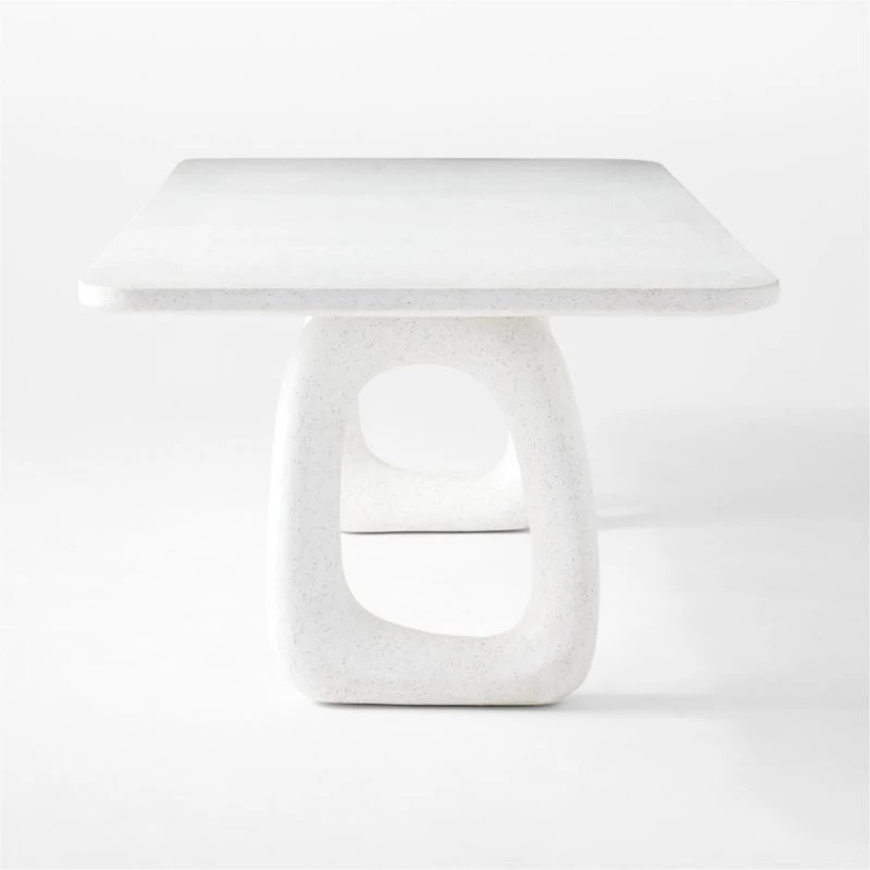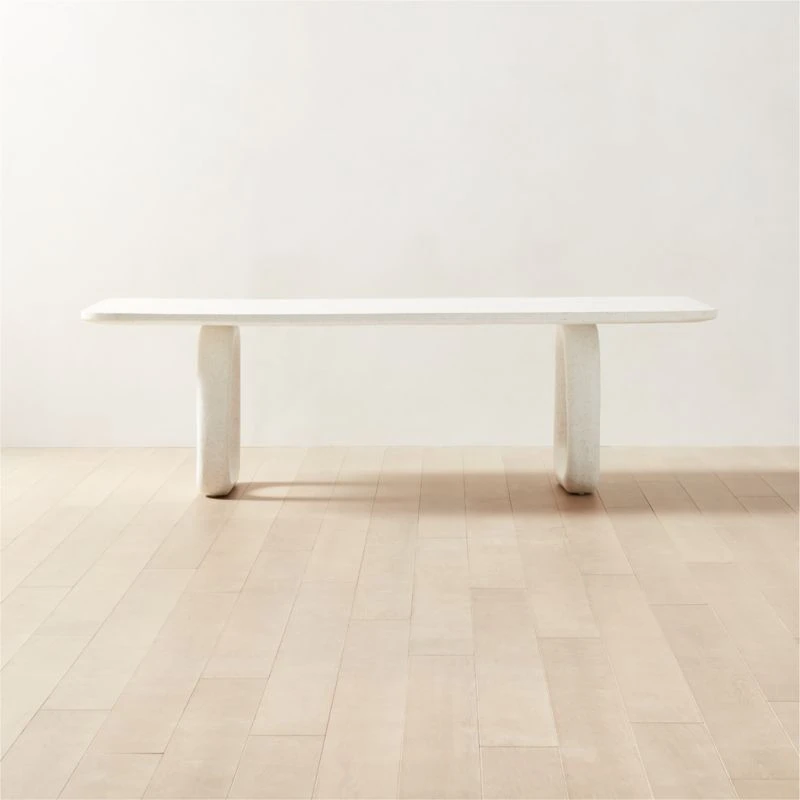 Minimalist in form, Caleb Zipperer’s design brings recycled beauty to the dining space. Cement is speckled with recycled glass chips, adding unique activity in the terrazzo that varies from piece to piece. Finished with a protective top coat, the large-scale dining table seats eight. CB2 exclusive.