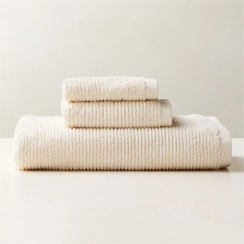 Organic cotton with ribbed texture makes the perfect everyday bath towel. Soft, absorbent—but not heavy—and beautiful in warm white. Set includes one bath towel, one hand towel and one washcloth. CB2 exclusive.