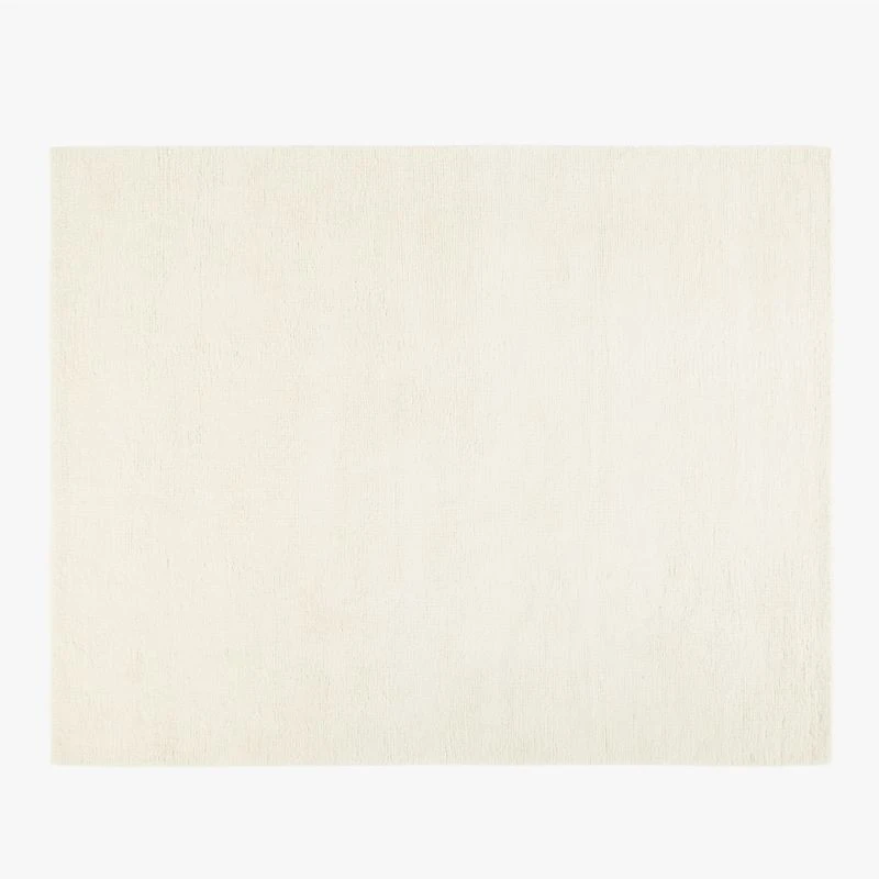 Luxe ivory rug is handwoven of pure merino wool for a softer, finer feel than traditional wool rugs. Hand-knotted with 16 knots per square inch and finished with clean, handbound edges, rug is double washed to produce rich, plush texture underfoot. Perfect for low- to medium-traffic areas, like the bedroom. CB2 exclusive.