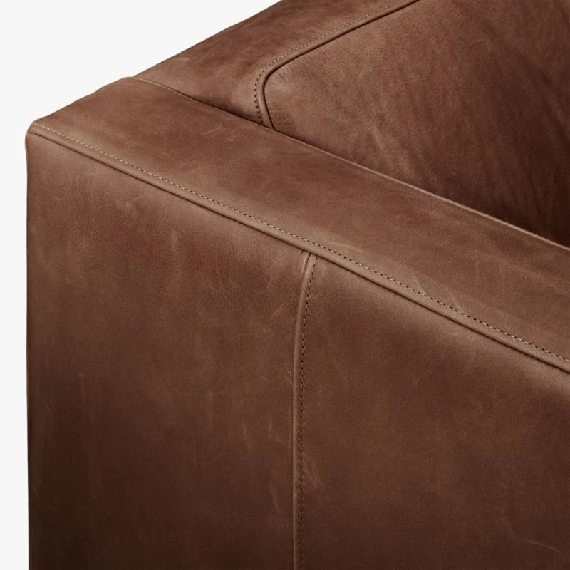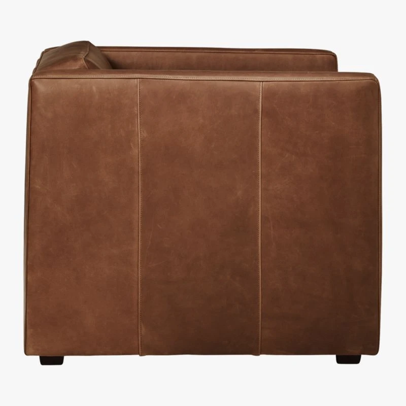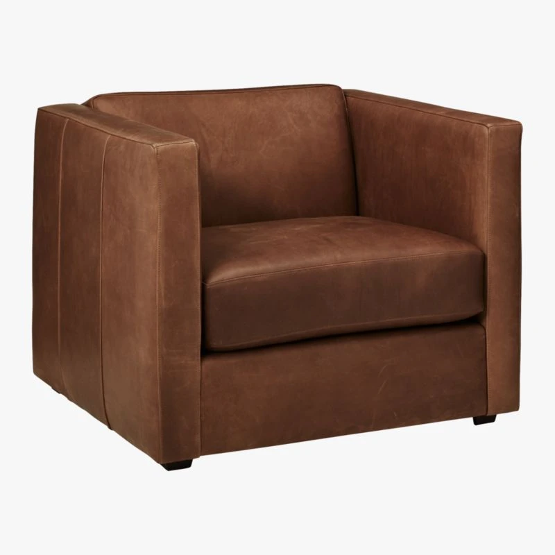 Our popular club chair squares up refined new proportions, scaled down ever so slightly with a fresh attitude. Dressed to impress in leather, it’s a plush update on the classic club. Exaggerated flange outlines boxy design that says ‘this is my space.’ Love the impromptu feel of the intentional seat cushion overhang and super comfy back that curves to relax/support just where you need it.
