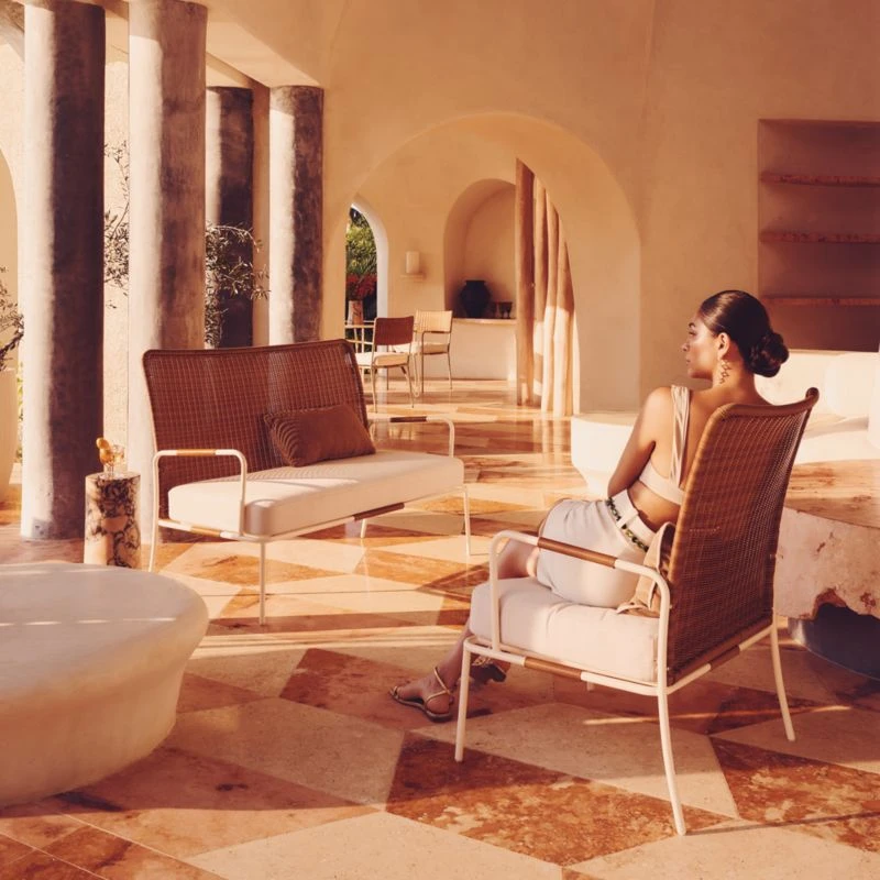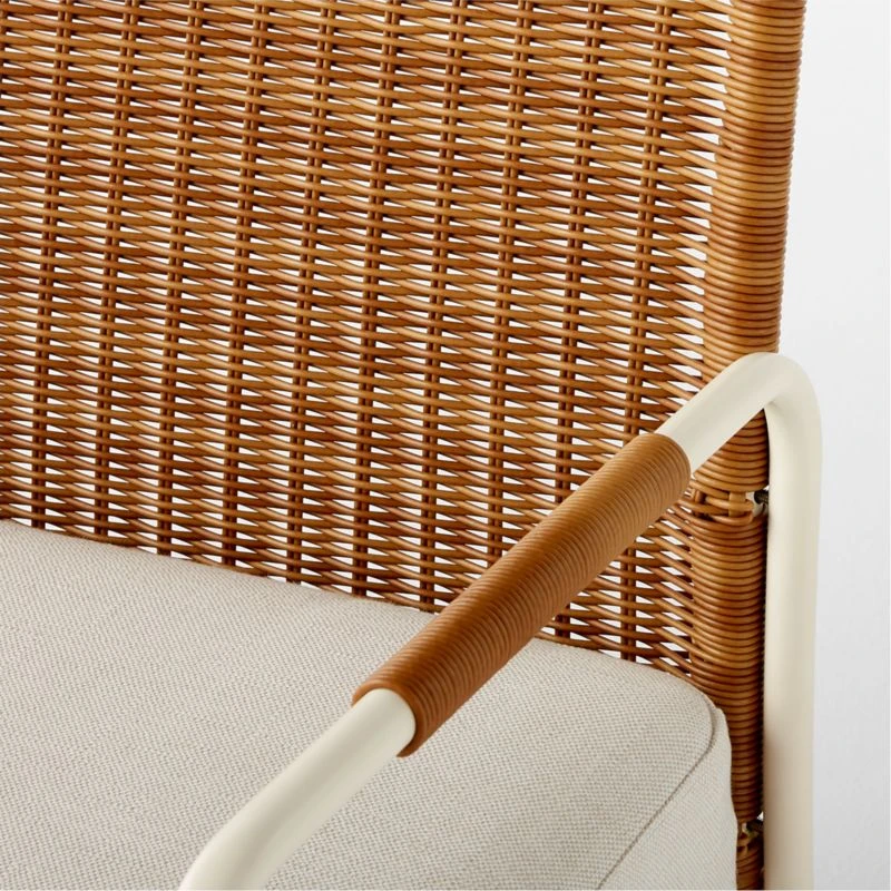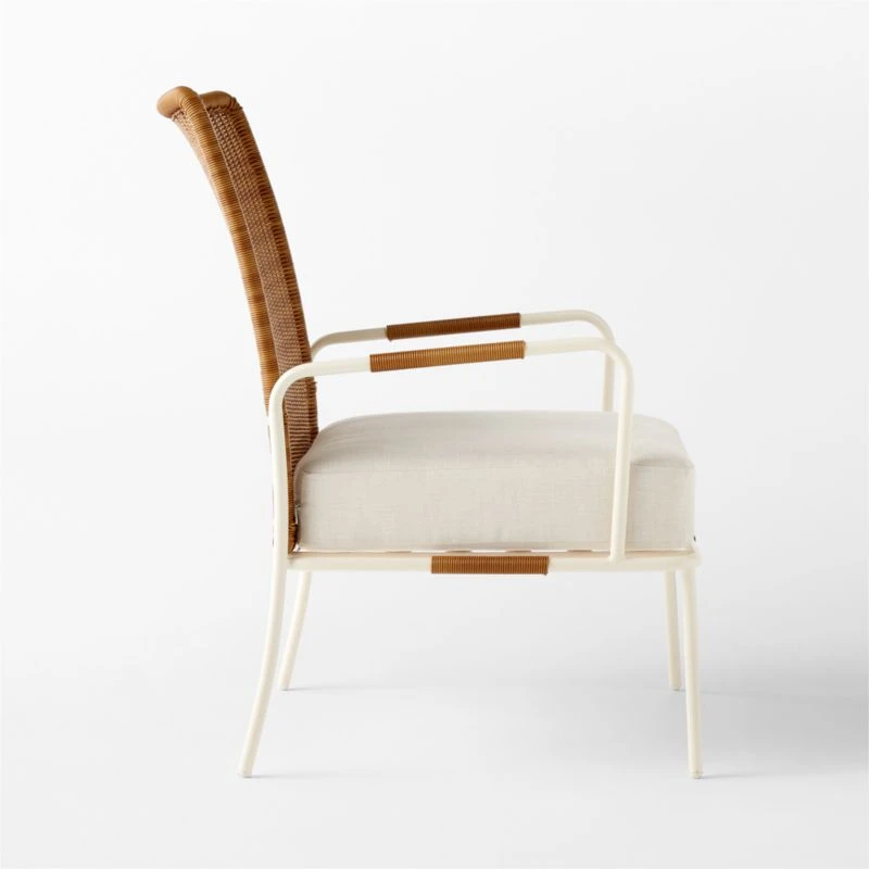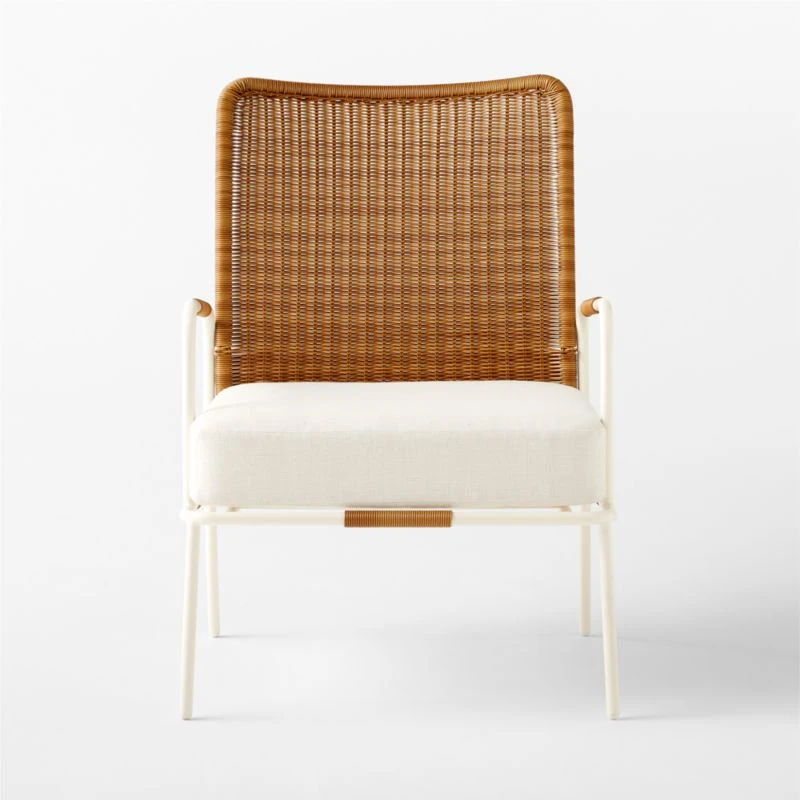 Paying homage to 1960s-style French villas, outdoor lounge chair by Ross Cassidy is understated in its luxury. Angular steel frame, powdercoated in an ivory hue, is accented by wrapped all-weather rattan to match the tall back. Plush, supportive cushion is covered in fade- and stain-resistant Sunbrella performance fabric to weather season after season of sunset cocktail hours. CB2 exclusive.