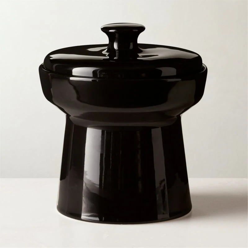 While staying authentic to the original 1959 design that still resonates today, our reissue of Paul McCobb’s Contempri Cookie Jar gets a dynamic update in new bone china with a shiny black glaze. Canister features a lidded coupe top and concave knob; includes a gasket to help keep all your snacks and treats fresh. Mix in other colors and materials from the famed designer’s Contempri collection to create your own iconic assortment. CB2 exclusive.