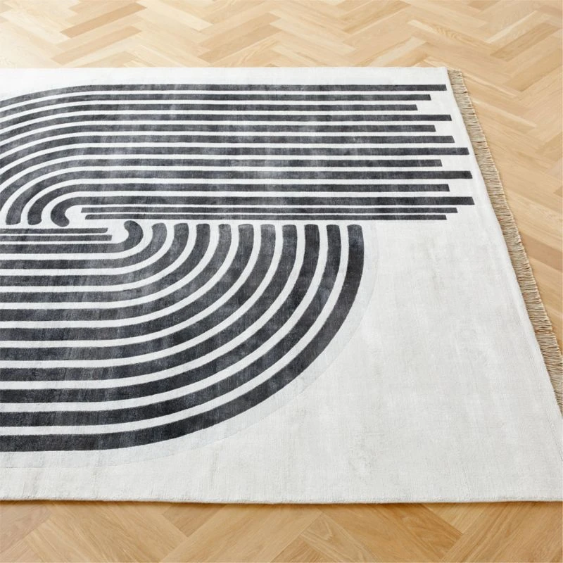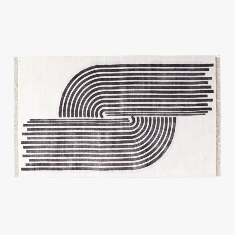 Two “heads” meet in this rug designed to honor the bond between Black women and their shared pride in the care and keeping of their hair. Created by Tavia Forbes and Monet Masters of Forbes Masters, this handloomed viscose rug is silky-soft and adorned with fringe. Beautiful and intricate curves of black and grey against an ivory background make a loving and impactful nod to cornrows, a hairstyle that originated in Africa and continues to impact the culture today. CB2 exclusive.