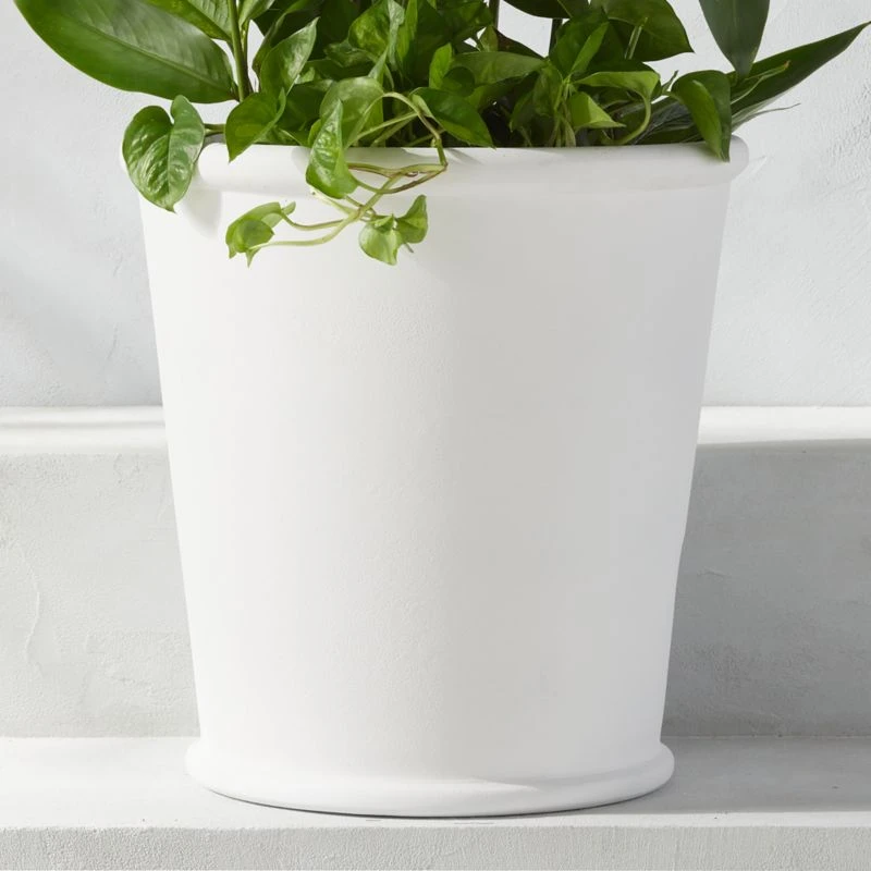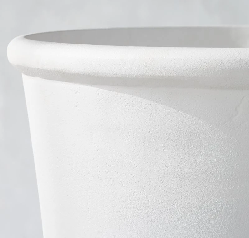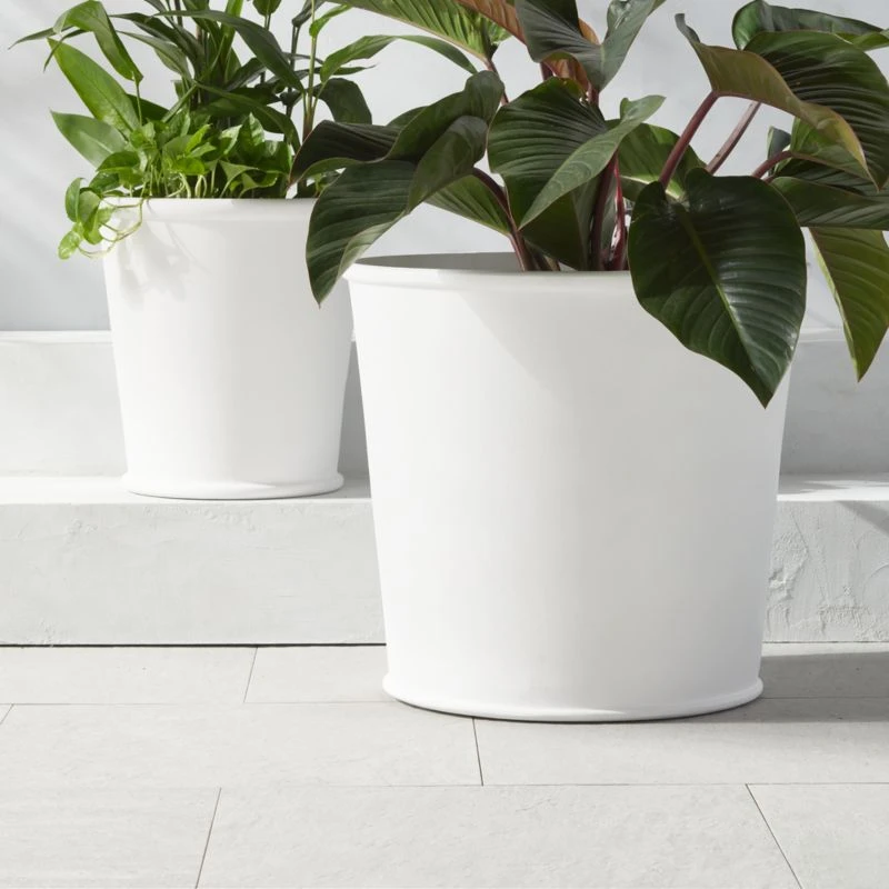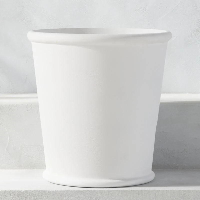 Crafted of sand-cast aluminum, Ross Cassidy’s Coulee planter collection evokes classic Mediterranean style thanks to its graceful rolled rim and base. Suitable for indoor or outdoor use, this small white planter is finished in white lacquer for a crisp, clean aesthetic that complements all types of greenery. CB2 exclusive.