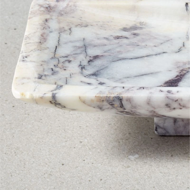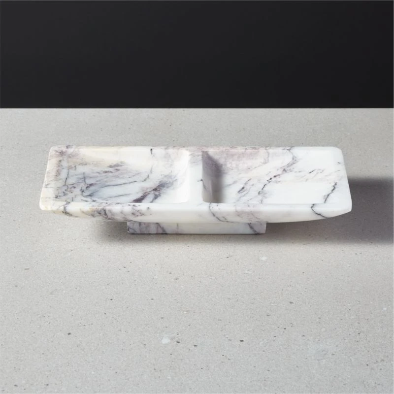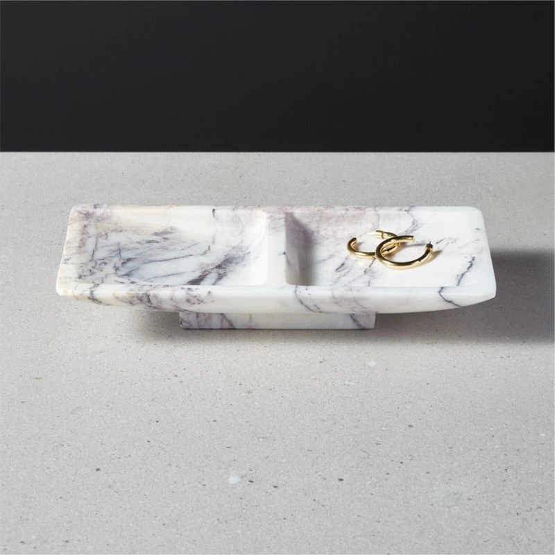 White floral marble is carved into two sections atop a small, plinth-like base to create an incredibly versatile jewelry tray. Designed by Jennifer Fisher, tray works on a dresser, in the bathroom or as a catchall to hold keys, etc. CB2 exclusive.