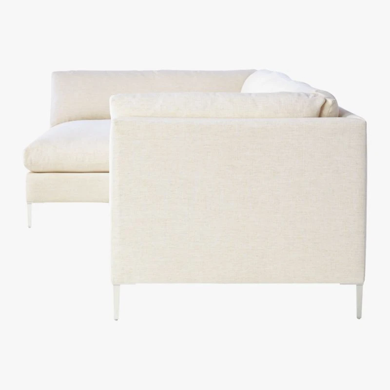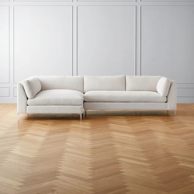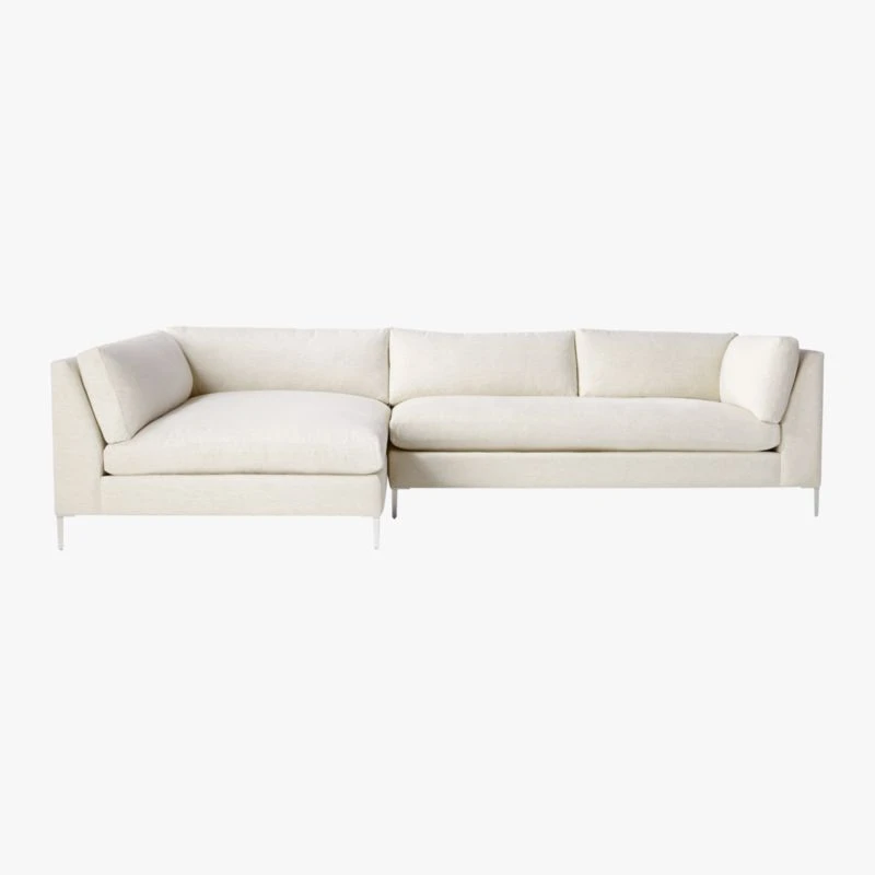 Generously scaled armless sofa provides extraordinary comfort. Tailored in snow white performance fabric, two-piece sectional sofa sits deep and spacious with the perfect balance of slouch and support. Cushions will continue to relax over time for a casual, comfortable look, all elevated on tapered legs that add a subtle gleam in brushed aluminum. Clean silhouette is accented by a left-arm chaise that offers opportunities to stretch out and unwind. CB2 exclusive.