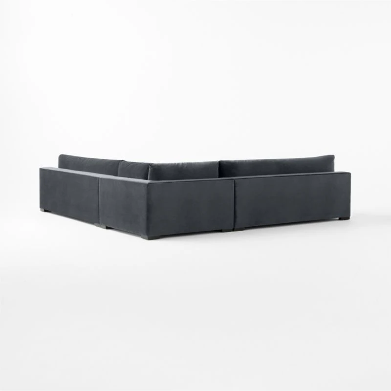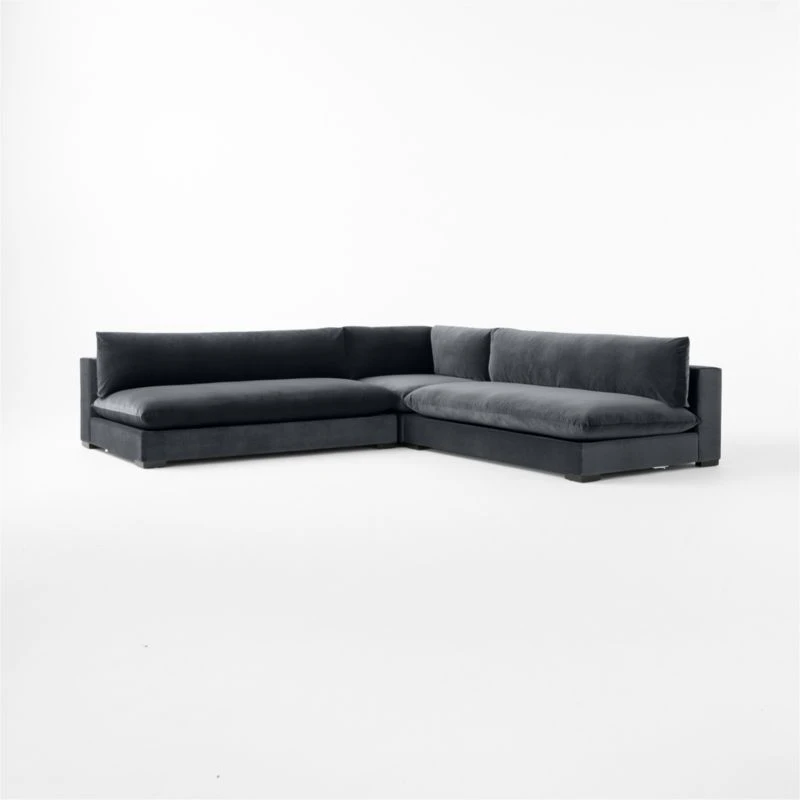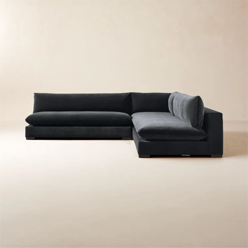 Upholstered in a charcoal performance velvet, large-scale sectional sits low to the ground for modern appeal. The plush silhouette features pillow-like detached cushions with broad armrests that can serve as a relaxed perch for socializing. Sectional pieces can be configured to suit your space. CB2 exclusive.