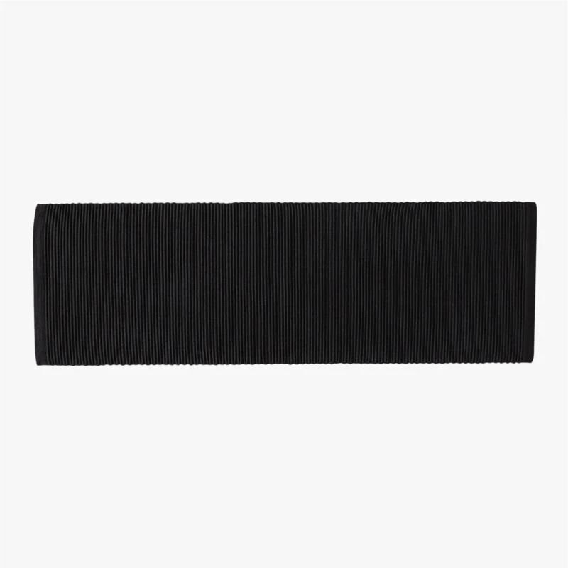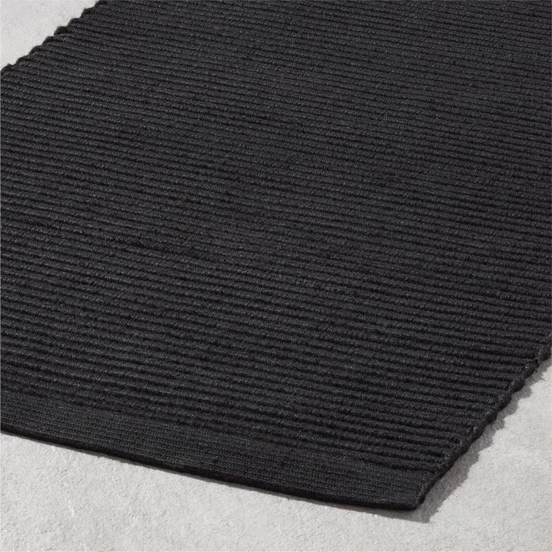 Woven by hand to create subtle texture, sleek black flatweave rug by Ross Cassidy is a minimalist addition to the indoor or outdoor living area. Ribbed performance fabric is designed to withstand the demands of high traffic, yet retains a decidedly sophisticated aesthetic that looks especially chic when paired with teak outdoor furniture. CB2 exclusive.