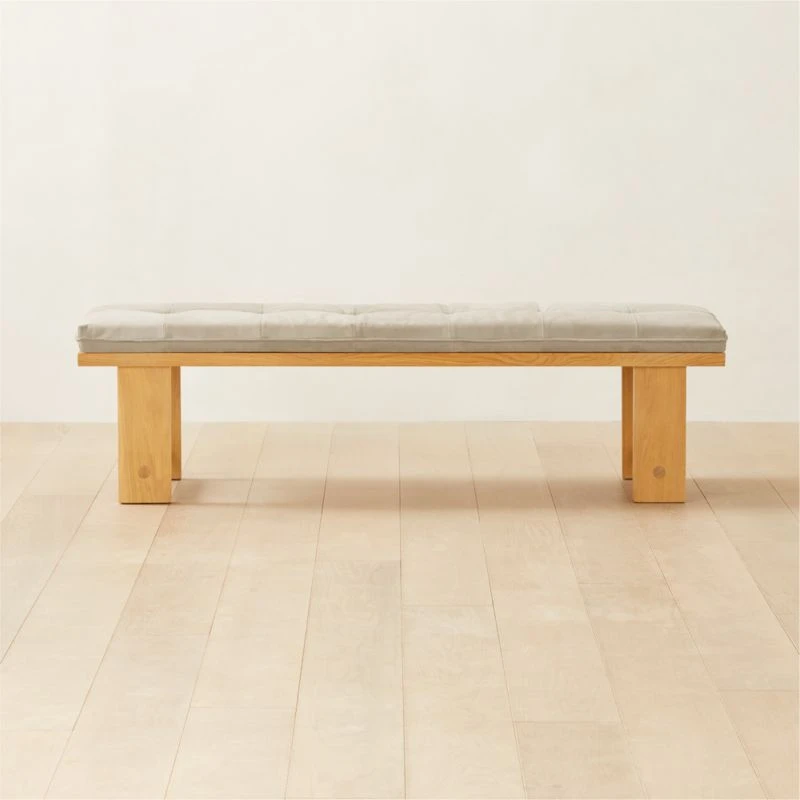 Equally suitable in the bedroom or entryway, bench by Lawson-Fenning blends straightforward design with intentionally visible craftsmanship details. Shaped from solid white oak, bench construction features joinery meant to last decades; removable welted suede cushion feels elevated with double topstitching and self-welt finish. CB2 exclusive.