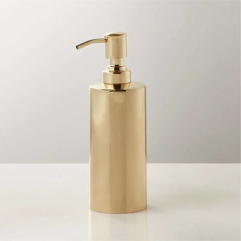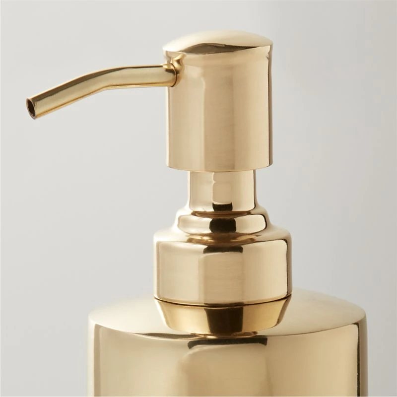 Handmade, real brass soap pump adds polish to your daily routine. Minimal design and sleek finish keeps it everyday. Coordinate with the full Elton Polished Brass bath collection for an elevated counter display. CB2 exclusive.