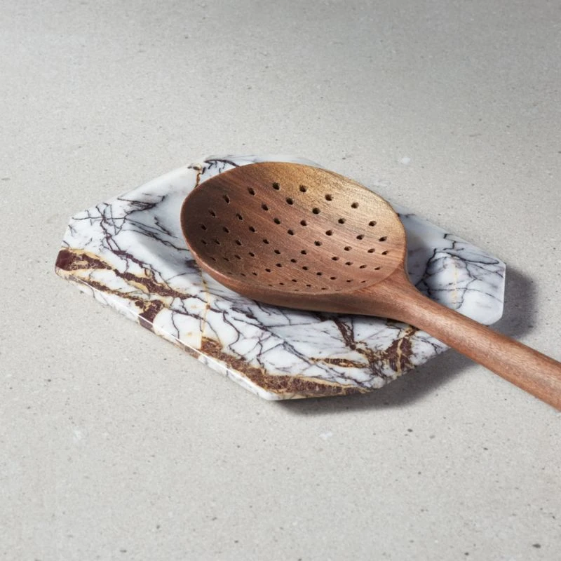 The beveled edge and emerald shape of this marble spoon rest by Jennifer Fisher fits her utensils perfectly. The shape is hand-carved from white floral marble to be wide enough to fit most utensils, then polished and finished with the Jennifer Fisher collection logo on the back. Because each spoon rest is crafted of pure marble, no two will be exactly alike. CB2 exclusive.