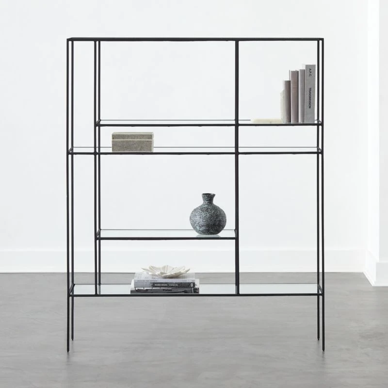 Designed by VUUE and inspired by vintage bookcases of the ’60s and ’70s. Thin iron rods with black textured finish outline an etagere with various clear glass shelves perfect for displaying treasures of all sizes. Low-profile and small-scale, piece is ideal for styling behind a sofa. Learn more about VUUE on our blog. CB2 exclusive.