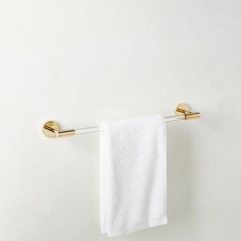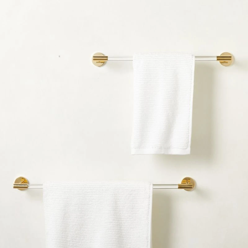 Round crystal towel bar offers a clean, feminine look. Solid brass hardware anchors the crystal glass, marrying an elegant mix of materials. Brass is unlacquered, offering a living finish with the patina of a vintage find. Collection also includes a wall-mounted hook and toilet paper holder. Pair with Flynn knobs and handles for a cohesive look. CB2 exclusive.