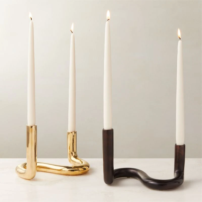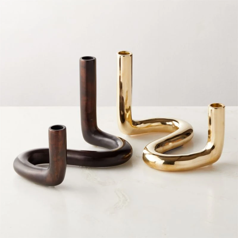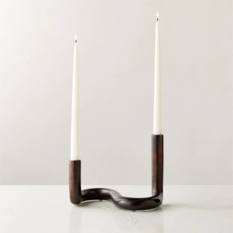 Solid brass is cast into a modern curved shape to support a taper candle on each end. Bronze plating adds a dramatic and luxurious finish. CB2 exclusive.