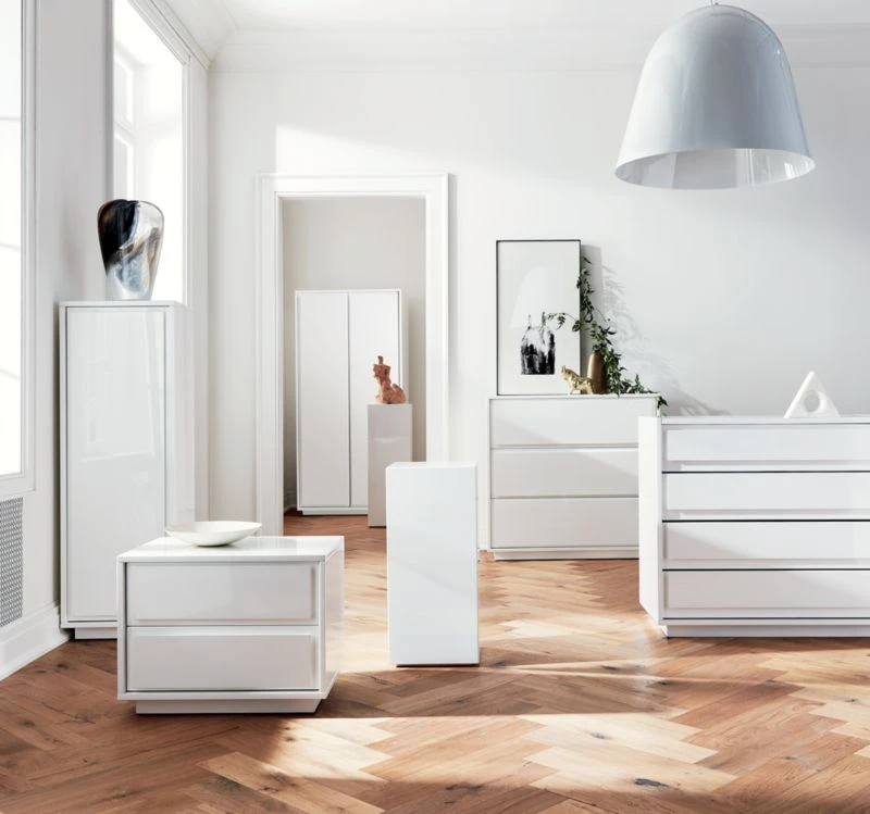 Minimal low chest takes a modern turn in glossy white lacquer. Three roomy drawers cut a clean line with recessed drawer panels rather than traditional hardware. Slim plinth base keeps it sturdy and sleek. Learn about Mermelada Estudio on our blog. CB2 exclusive.