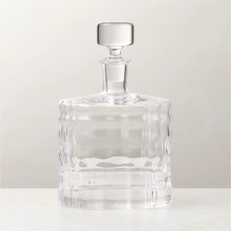 Handblown glass decanter showcases undulating waves across its surface—an effect entirely attributable to its handcrafted nature. Capped with an oversized glass stopper for extra drama on the bar. CB2 exclusive.