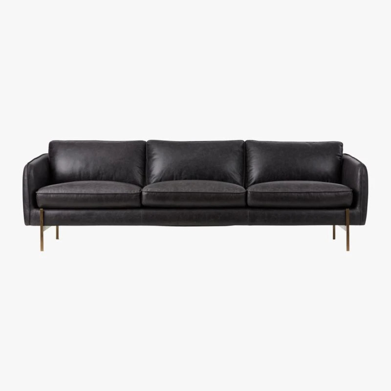 The standard sofa stretches out on a modern frame wrapped in rich black leather. Designed by James Patterson, the sofa’s slim, discreet profile is edgy and sleek. Brushed brass finished legs squarely support the generous seat, upholstered in dark leather that will continue to patina with character over time. Learn more about James Patterson on our blog.
