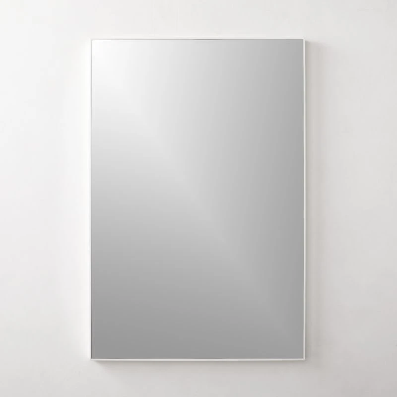 Mirror image without bounds: framed thin, trim and exact in pure extruded aluminum with a bright white finish. Handmade frame resists corrosion so it’s perfect in the bath. Cleat mount for horizontal or vertical placement. Mounting hardware included. CB2 exclusive.