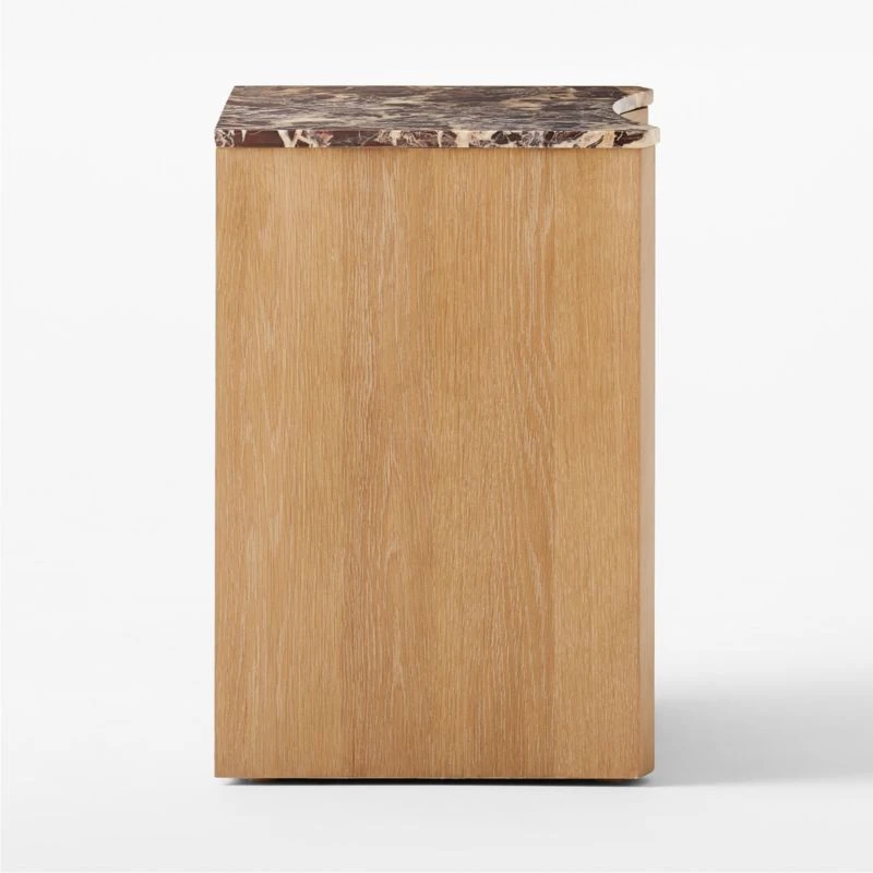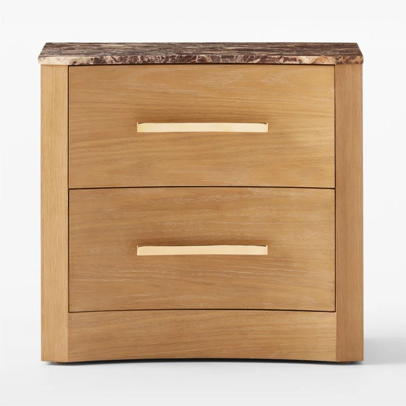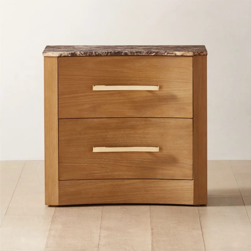 Caleb Zipperer’s design elevates the bedroom with a mix of high-end materials. Curving inward, the unique silhouette is crafted of solid oak certified sustainable by the Forest Stewardship Council ® with a slab of Red Levanto Marble on top. Polished brass handles on the soft-close drawers complete the architectural look. CB2 exclusive.