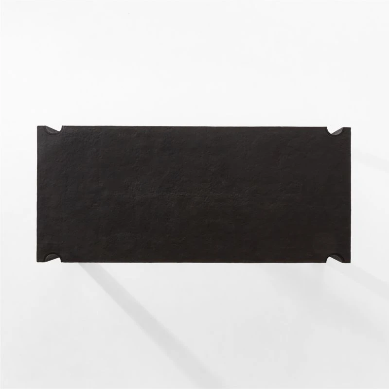 Brutalist-style outdoor dining table by Ross Cassidy brings a sculptural spirit to the outdoor living area. Made of hand-poured sand-cast aluminum with a raw bronze finish, the table has a rugged, organic texture throughout. Semicircle cast legs have a chiseled appearance, playing up the negative space that gives the piece a remarkably artistic feel. CB2 exclusive.
