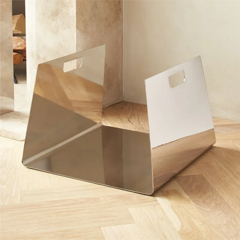 Seamless bent iron creates an angular log holder that shines with a polished nickel finish. Designed by Jannis Ellenberger, log holder is a perfect complement to the Maddox fireplace screen and tools. CB2 exclusive.