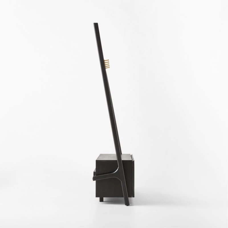 From Melbourne-based design studio VUUE, modern hall tree brings high design to entryway storage. Mahogany certified sustainable by the Forest Stewardship Council ® is finished in a dark black stain that still allows the grain to show through. Hidden drawer adds a stunning pop of natural cane that contrasts beautifully with the sleek black mahogany. Solid brass hooks hang from a bar at the top to support coats, scarves and hats. CB2 exclusive.