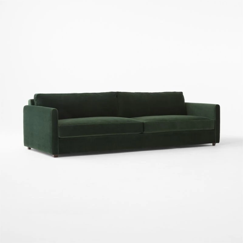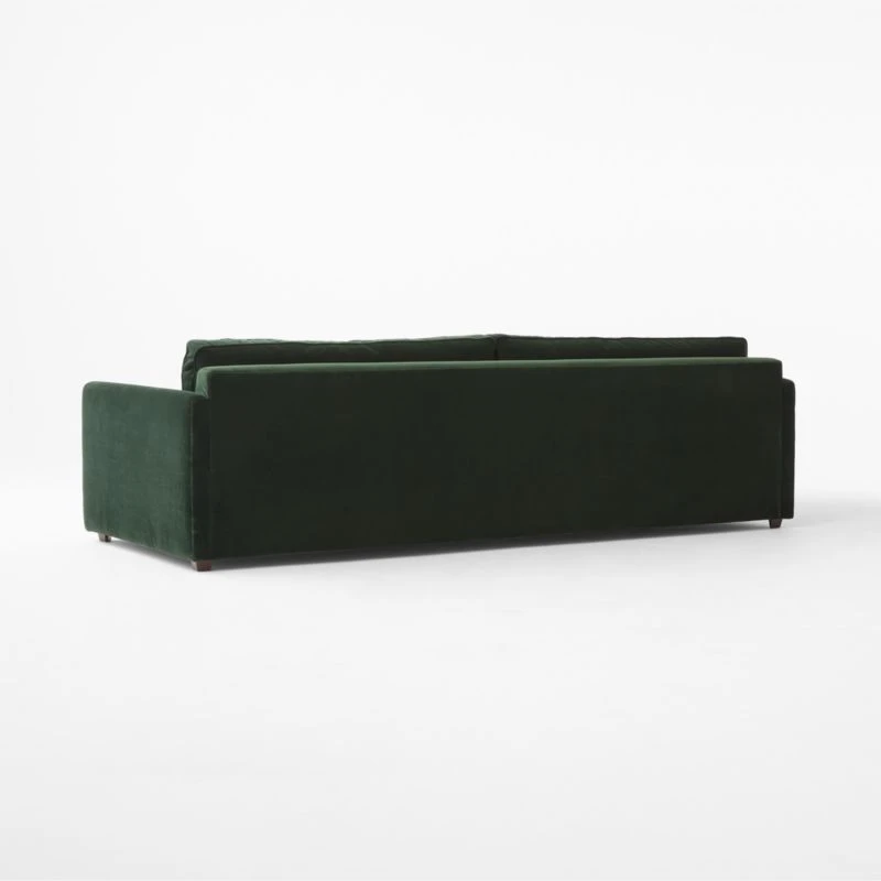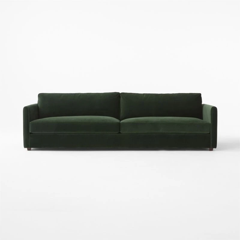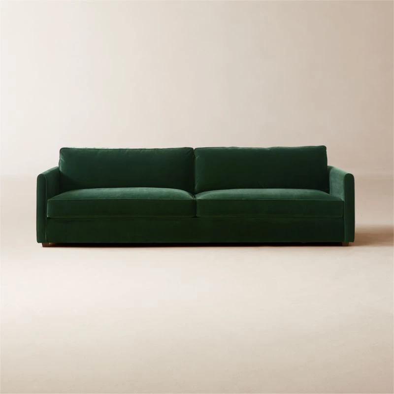Minimalist sofa draws attention with its rich green velvet upholstery. Woven by a mill operating for six generations in South Carolina, plush velvet features subtle light-catching striations in the yarn for a lustrous finish. Seat and back cushions are tailored with a crisp welt trim. CB2 exclusive.