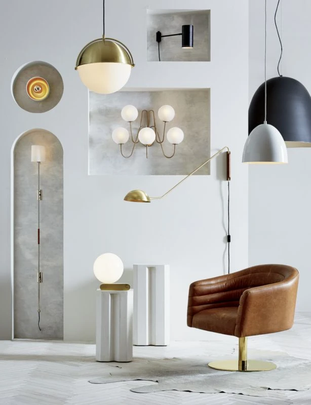 - Brass-finished steel pole and shade with brass-colored shade interior