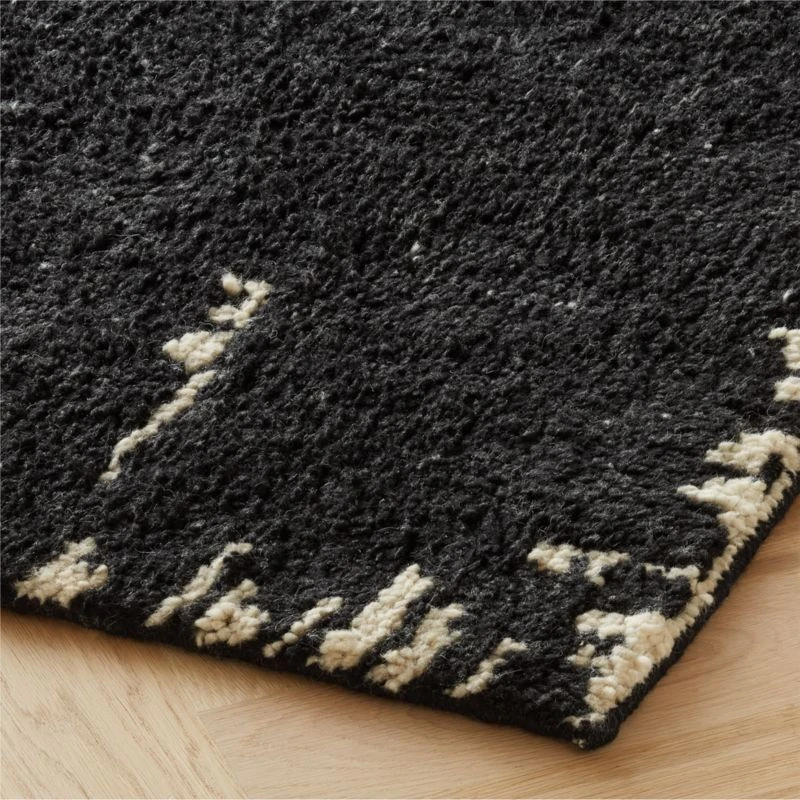Hand-knotted at 10 knots per square inch from pure New Zealand wool, this area rug’s minimalist black and white palette is edged in a unique graphic design. The deep half-inch pile creates a plush shag underfoot. CB2 exclusive.