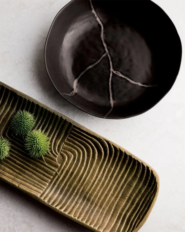 Inspired by Japanese Kintsugi, the art of repairing broken pottery with lacquer and gold. Black serving bowl design embraces the philosophy of treating cracks and repairs as part of the history of an object, rather than something to hide. Handpainted and glazed, each will be unique. CB2 exclusive.
