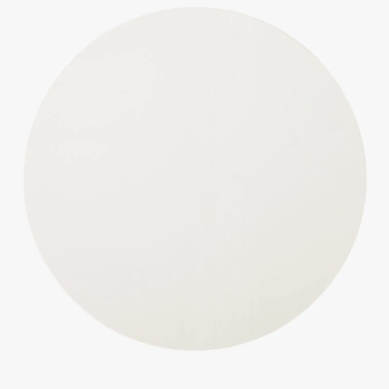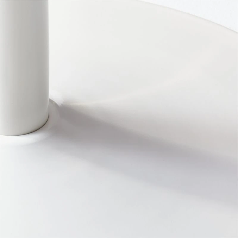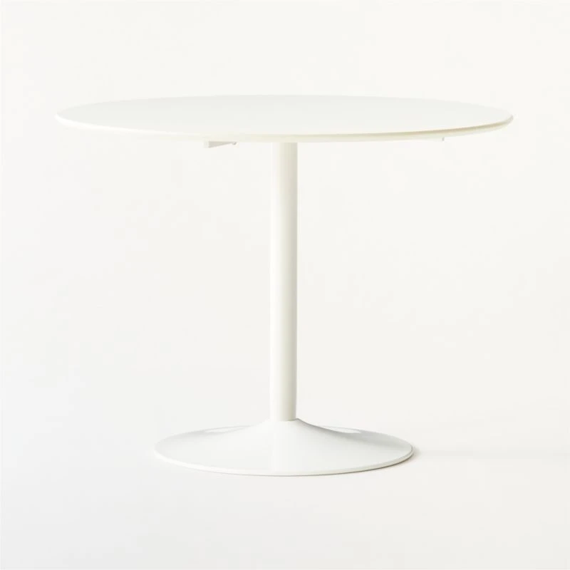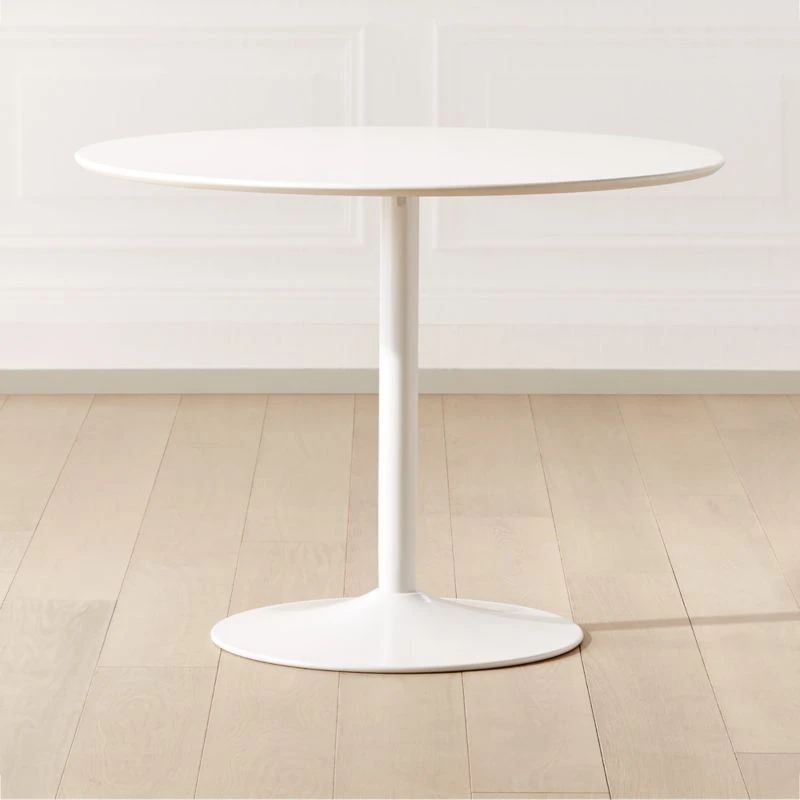 A high styling, hardworking table for all your spaces: dining, kitchen, living, office. White lacquered wood composite disc beveled at the edge floats on a white powdercoat metal pedestal that seems to emerge from the floor. CD of “Also Sprach Zarathustra” not included.