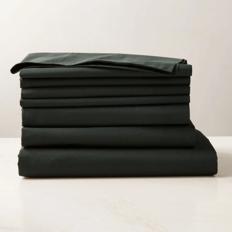 Lightweight and breathable, percale 400-thread-count bedding offers year-round comfort in a deep dark green hue. Made of premium organic cotton, percale is cool to the touch, making it ideal for those who sleep warm. Set includes one duvet cover, one fitted sheet, one flat sheet, two pillowcases and two shams. CB2 exclusive.
