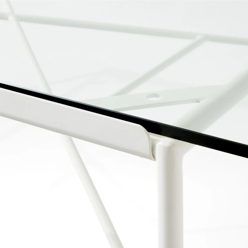 First introduced as part of the Aerial Dining Group in Paul McCobb’s 1952 Pavilion Collection, this large dining table was designed to be durable, beautiful and easy to care for. The modern design of the table’s satin ivory iron frame can be seen through the tempered glass top. The Pavilion Collection was featured in the June 1953 issue of House & Garden magazine in an original McCobb illustration, yet doesn’t feel at all out of place in a modern outdoor space or even an indoor dining room. CB2 exclusive.