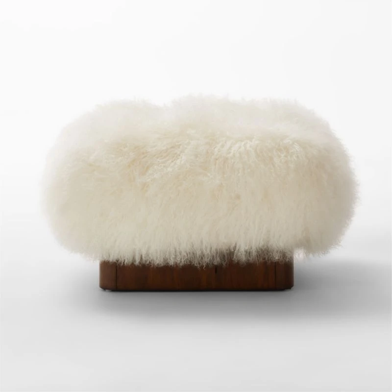 Rubberwood veneer in a midtone stain sets the base for an untamed pouf of humanely sourced white Mongolian sheepskin. Designed by Studio Anansi, statement ottoman looks incredible in a bedroom or styled with a tray on top. CB2 exclusive.