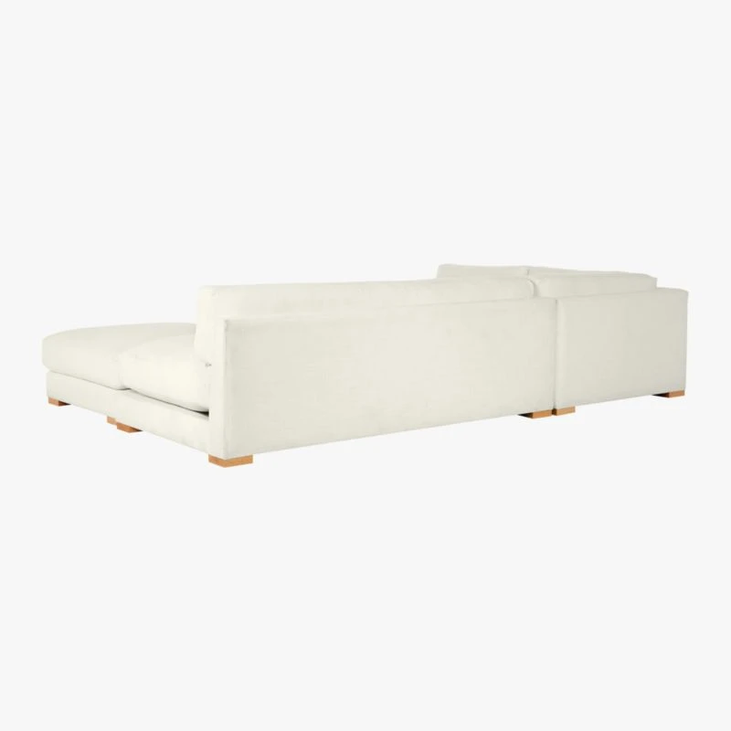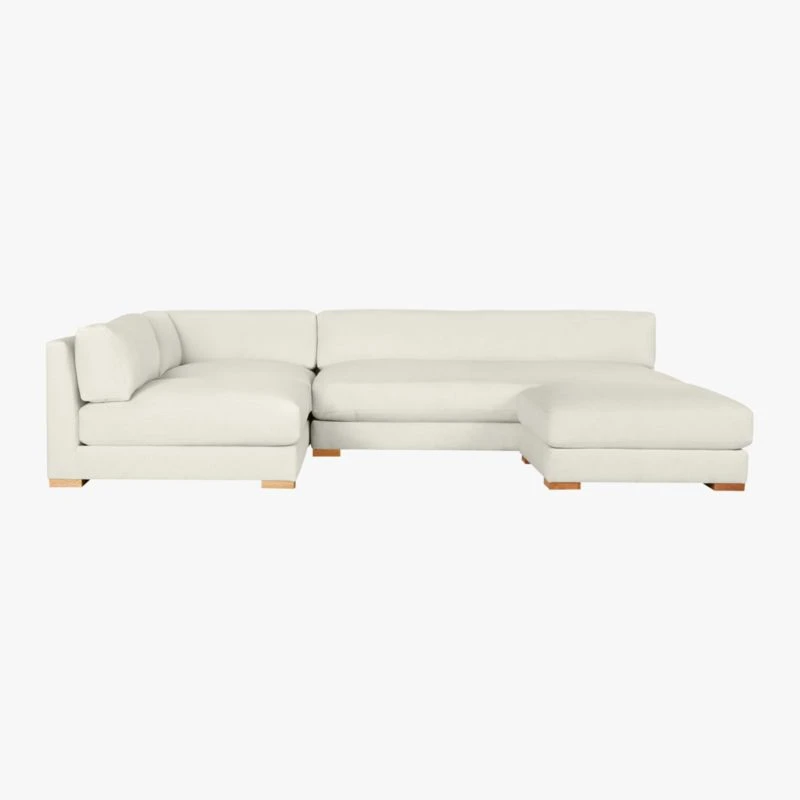 Long, lean, super deep four-piece full sectional lounges low on four solid hardwood feet—an elevated update that appreciates high-end craftsmanship and honest materials. Clean silhouette has a plush, pillowed feel thanks to the improved feather-down cushion design. Soft white linen-blend upholstery plays well against the contrasting hardwood feet. Sectional set includes armless chair, corner chair, ottoman and armless sofa. Can be configured in various ways. CB2 exclusive.