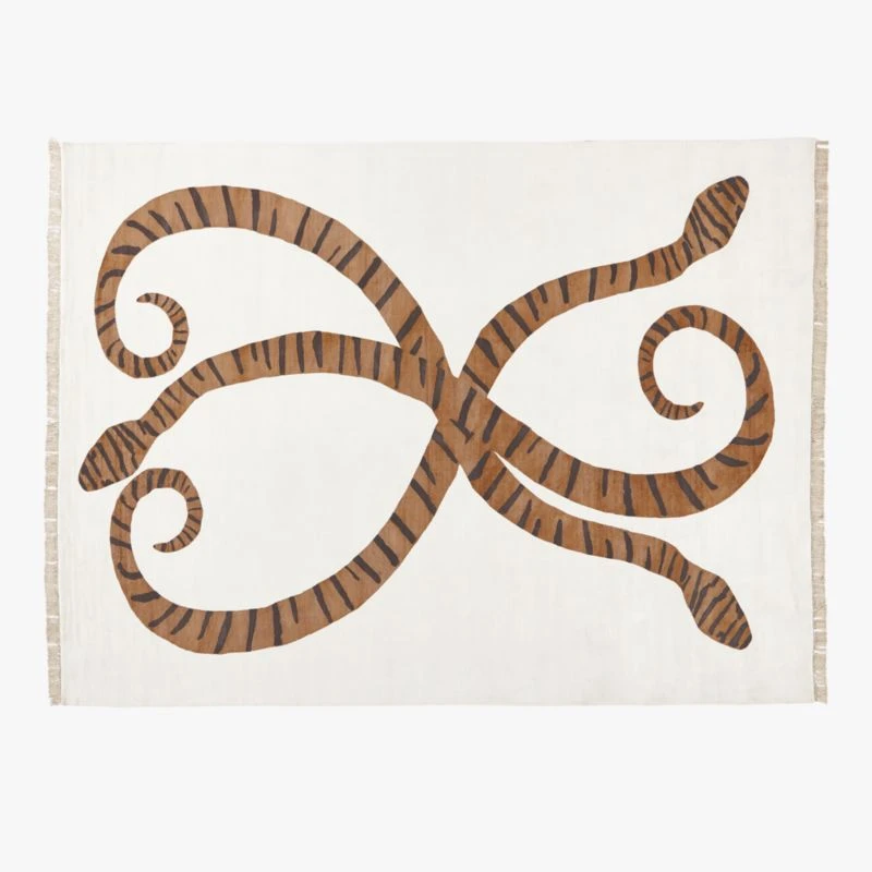 Designed by fashion-designer-turned-home-designer Brett Beldock, three snakes intertwine in tonal neutrals on this modern statement rug. Guided by her unique sense of style, Beldock’s fashion-forward design is printed by hand on viscose yarn to give it a soft, silky feel underfoot. Handloomed and finished with fringe, luxe rug is ideal for low-traffic areas. CB2 exclusive.