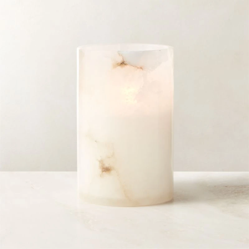 Small candle holder begins as a solid piece of pure alabaster, then is carefully carved into an elegant cylindrical shape. Polished to a shine, it becomes luminous when a pillar candle flame flickers within. As alabaster is a natural stone, each piece will have variations that ensure its unique beauty. CB2 exclusive.